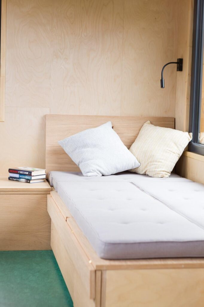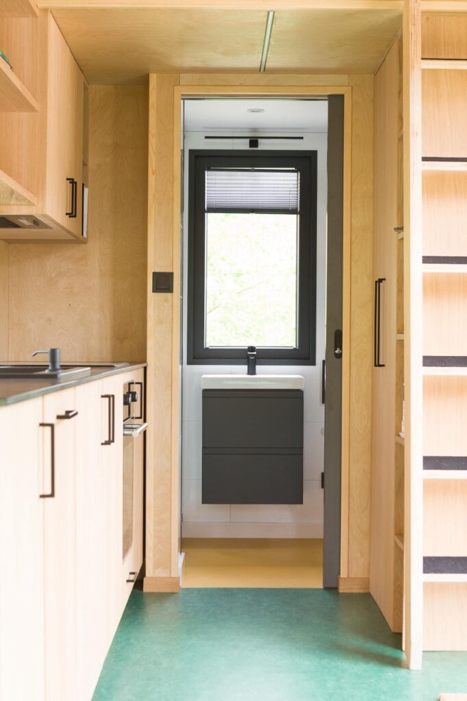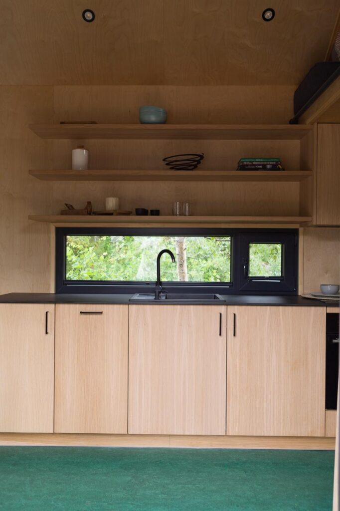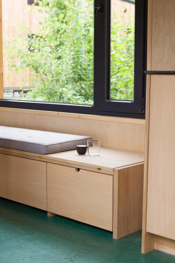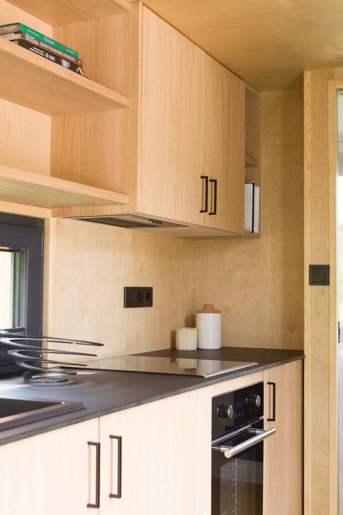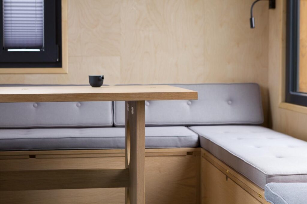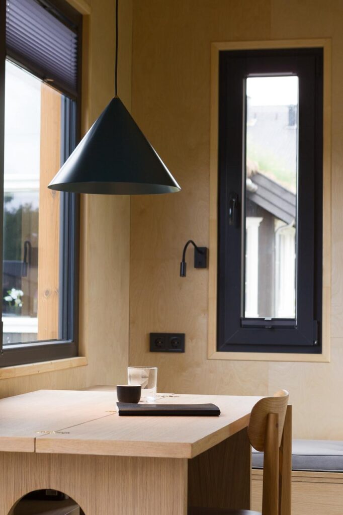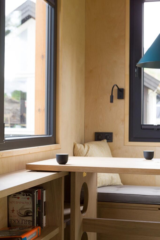Dom został zaprojektowany z najwyższej jakości materiałów naturalnych. Wnętrze wykończono drewnem brzozowym (ściany i sufit), a meble i elementy dekoracyjne wykonano z drewna dębowego.